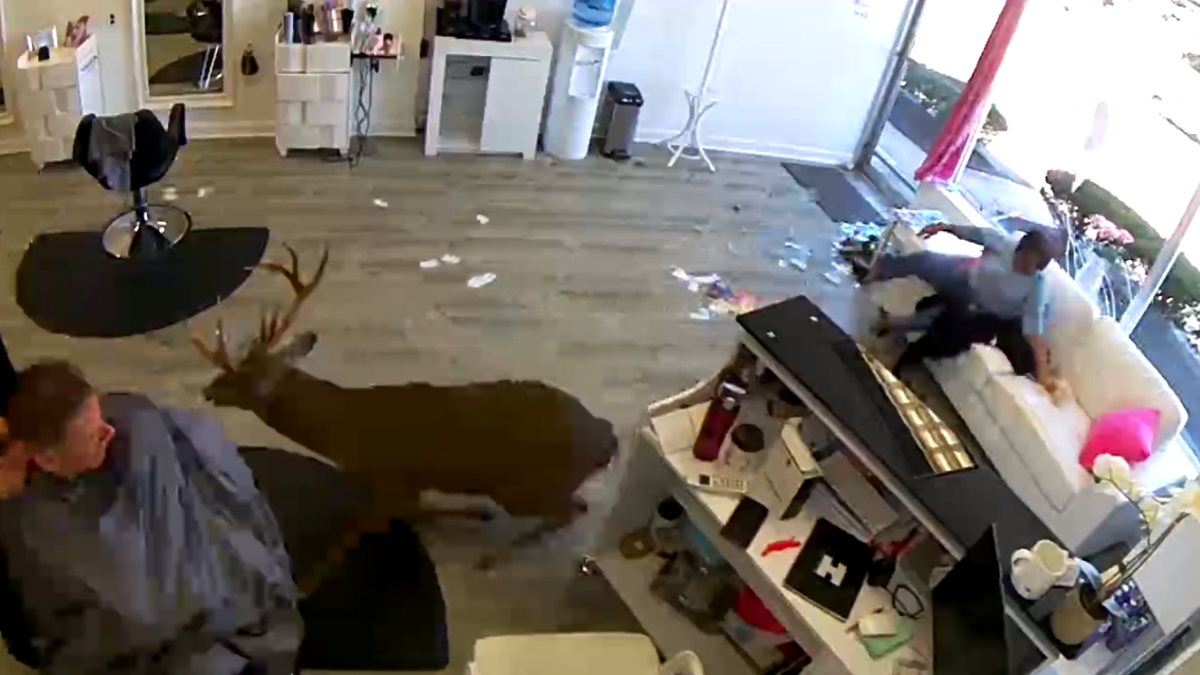 Video posted by the salon's Facebook page shows the 6-point buck running across traffic and crashing into the large plate glass window that faces the street, sending shards of glass flying across the shop. The deer leaps over one customer who was seated on the couch next to the window and then scrambles through the salon until it ends up in the shop's breakroom. The surveillance video shows Heredia and her client moving away to avoid possibly being injured by the animal.